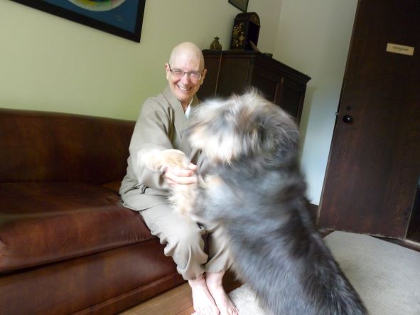 If I am not entirely at ease with the structure and forms, it is not at all difficult to feel at ease with the abbot—Shinge Roko Sherry Chayat. She comes to our interview with her dog, Nikita. Throughout the conversation she’s relaxed and informal. She pauses reflectively before answering my questions, and her responses are cogent and articulate. She interviews well. One of her students tells me that he sees in her someone who genuinely embodies the Four Vows.