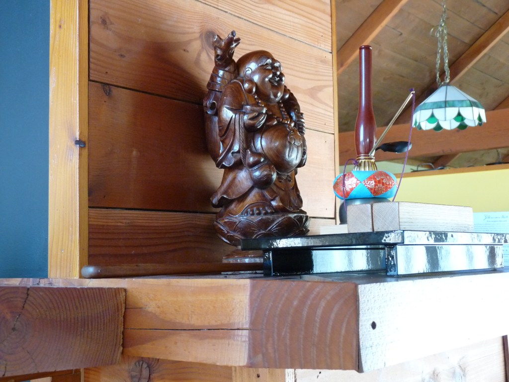 The center was in his home, a small wooden house on a lot with a second building used for rentals. The path to the front door is lined with a statue of Kannon and a couple of garden gnomes. I knock on the door of the rental house and a young boy, approximately eleven years old, comes out of the other house and asks if he can help me. He introduces himself as Eshu’s son and directs me to the correct building. He, his mother, and his younger sister, leave as I arrive. “I hope it goes well, Dad,” he calls as they get into their car.